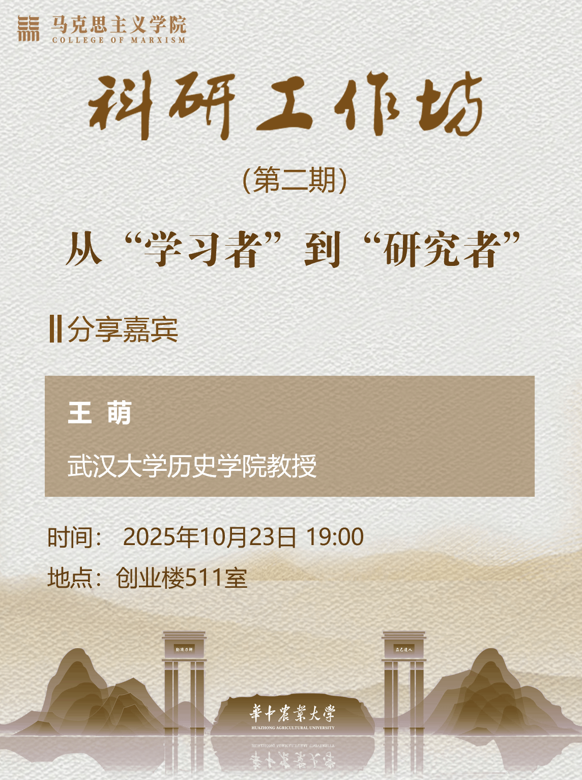 2025年10月23日晚七点,必赢242net官网科研工作坊(第2期)在创业楼511成功举行,武汉大学历史学院王萌教授应邀作“从‘学习者’到‘研究者’”的专题讲座。讲座由思想政治教育系主任郑鹏主持。