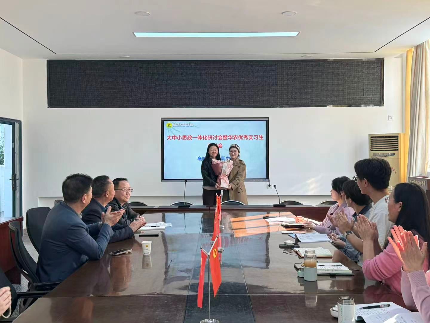 10月28日下午,实习生欢送会在华农附属学校劝学楼318会议室举行。必赢272net入口发展规划部部长程华东,附属学校校长余敏,实习指导教师宁洁、姜丽、张倩、鲍爱霞,必赢242net官网实习小组教师李凤兰、汪华及思政专业实习生等出席会议。会议由余敏校长主持。会议伊始,余敏校长对四位实习生各项实习工作表示充分肯定,表示实习生们工作作风务实、工作态度严谨,以扎实的专业表现获得了指导老师们的一致好评。随后宁洁老师作为实习指导老师代表发言。宁老师表示,四位实习生在实习期间始终踏实肯干、潜心向学,以饱满的状态投入工作,以谦逊的态度虚心求教,展现出良好的职业素养和综合能力。三名实习生也依次发言,从不同角度分享了实习期间的感悟与收获,并对老师们用心指导表达感谢。最后,程华东部长表示,本次实习成效显著,达到多重育人目标。在附属学校良好育人氛围中,实习生们展现出扎实专业素养和能力,后期还需通过实践总结与反思,实现从感性体验到理性认知的提升,进而准确把握教育强国的目标要求。他还表示,本次实习是两校深化合作的新起点,未来将立足长期主义,充分发挥附属学校九年一贯制的天然优势,以具体合作项目强化价值引领,推动大中小学思想政治教育一体化建设走深走实、再上新台阶。